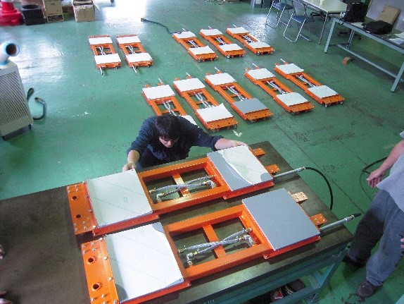 導入事例 製品について問い合わせる パンフレットダウンロード 2分割タイプのエアパレット 半導体製造装置メーカー:組立ラインでの移動 エアキャスター関連, エアキャスター, エアキャスター搬送台車, エアブランク 移動重量:6t 概要 ・製造ラインの製品に合わせて、使用台数や差し込み位置を変えることが可能 ・連続組立の生産ラインでの移動と、次の工程までの手押し搬送用として使用 生産ラインでの移動で、2台の台車を使用して一つの装置を移動 エアキャスターとキャスター、1台車に2台のエアキャスターを装備 同様の軽量薄型台車(極力軽量化したモデル)