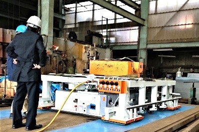 ・門型架台のデッキに搭載された装置をエアキャスターで支持し、AGVが移動装置として作動する