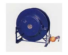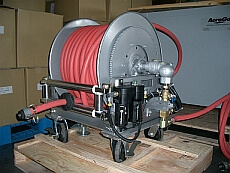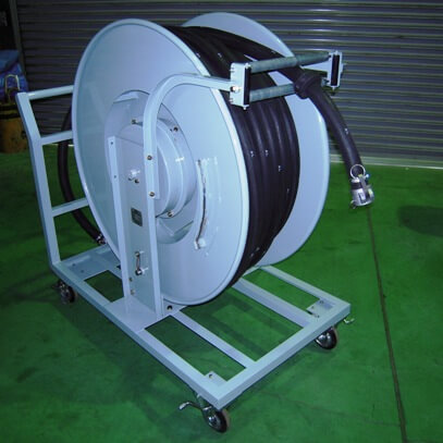 キャスター付き台車上にホースリールが配置されている。ホース繰り出し口には4方ローラー付き