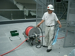 作業者が右手に持っているのは、ホースリール巻き取り用のエアモータのコントローラーです。